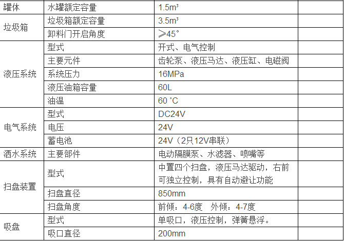 1.5方不銹鋼水罐,4方不銹鋼塵罐。帶掃盤4把,江鈴78馬力副發(fā)動機;意大利馬達Brevini- BMR125;法國施耐德控件開關(guān);臺灣百部精機電磁閥組SWH-G02-C4-D2H;免維護自分離式離合器;免維護風機;尾部LED箭頭燈,手動泵應(yīng)急系統(tǒng)。刷臂轉(zhuǎn)動機構(gòu)使用高新耐磨工程隔套,免打黃油;精密冷彎無縫液壓油管。