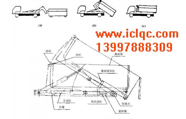 鉤臂式垃圾車(chē)通過(guò)鉤臂架裝置完成兩種不同的功能動(dòng)作:換箱和傾卸。