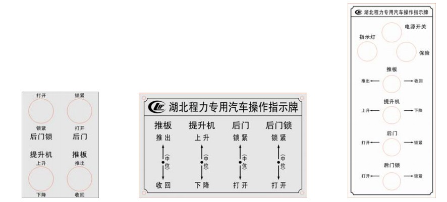 該車操作控制為 3 個位置分別在駕駛室內(nèi)(電控)、箱體前端手動(備用)和箱體前端提升機(jī)傍邊(電控),均可以獨(dú)立控制操作該車的工作。具體操作請遵循以下步驟進(jìn)行。在裝載垃圾或卸料前,空載運(yùn)轉(zhuǎn)達(dá)到 6 個標(biāo)準(zhǔn)氣壓時,掛上取力器(駕駛室內(nèi)方向盤左下方),液壓油泵開始工作,檢查各部件有無泄漏或異常后,再按照操牌指示位置和操作方法進(jìn)行操作; 同樣,在該專用車的各項專用功能操作完成后,摘掉取力器,使液壓系統(tǒng)停止工作。 垃圾運(yùn)輸車操作指示牌 如圖: