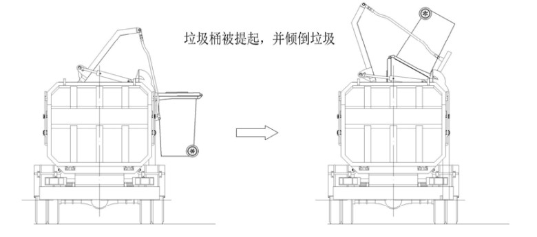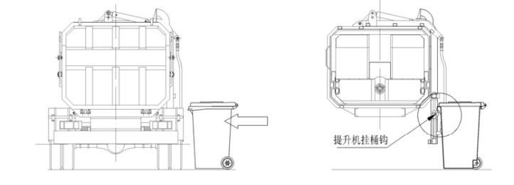 首先將垃圾桶推移到提升機(jī)掛鉤處,同時將桶提掛位放在掛鉤上,推動提升機(jī)操作開關(guān)(或手柄)至上升位置,這時上蓋油缸動作,從而帶動提升機(jī)拉桿向上運(yùn)動,垃圾桶被掛起,同時上蓋也逐漸被打開;如圖: