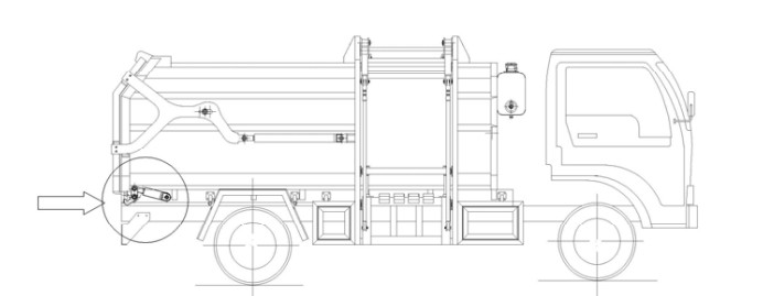 在推卸垃圾過程前,首先必須打開后門鎖緊鉤,即將后門鎖操作開關(guān)(或手柄)推至打開位置,鎖緊油缸帶動鎖緊鉤轉(zhuǎn)動,待鎖緊鉤脫開后,松開開關(guān)(或手柄)回中位,準(zhǔn)備開啟后門;如圖: