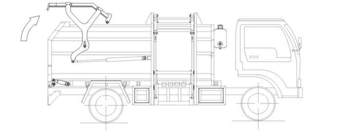 再將后門操作開關(guān)(或手柄)推至打開位置,后門在箱體兩側(cè)的油缸的推動先水平移動,然后向上翻轉(zhuǎn)開啟,待后門完全開啟后,松開操作開關(guān)(或手柄)回中位,準(zhǔn)備推卸垃圾;如圖: