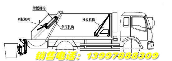 裝垃圾:壓縮垃圾車(chē)通過(guò)液壓翻轉(zhuǎn)機(jī)構(gòu)將垃圾裝人填裝器內(nèi),操作刮板,滑板沿弧型斗體將垃圾刮起,使用負(fù)壓將垃圾推進(jìn)垃圾箱內(nèi)。