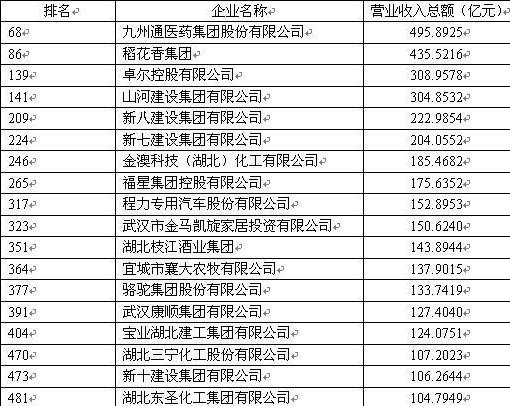 我省入圍的18家企業(yè)分別是:九州通(68位)、稻花香(86位)、卓爾控股(139位)、山河建設(shè)集團(tuán)(141位)、新八建設(shè)集團(tuán)(209位)、新七建設(shè)集團(tuán)(224位)、金澳科技(246位)、福星集團(tuán)(265位)、程力專汽(317位)、金馬凱旋(323位)、枝江酒業(yè)(351位)、襄大農(nóng)牧(364位)、駱駝股份(377位)、康順集團(tuán)(391位)、寶業(yè)湖北建工(404位)、三寧化工(470位)、新十建設(shè)集團(tuán)(473位)、東圣化工(481位)。