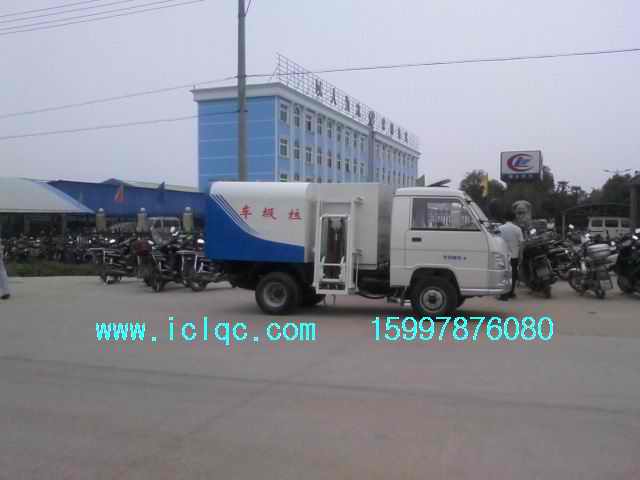 自裝料裝置:自裝料裝置設(shè)在貨廂的前部側(cè)面,由支架、油缸、鏈條機(jī)構(gòu)、吊鉤等組成。使用此裝置可將外部圾桶內(nèi)的垃圾提升裝入貨廂內(nèi)。